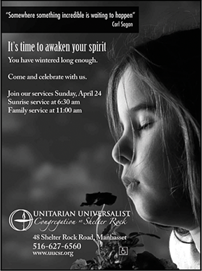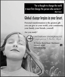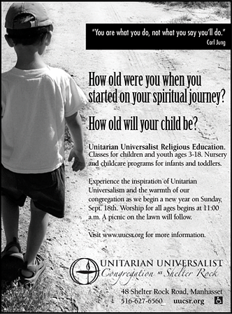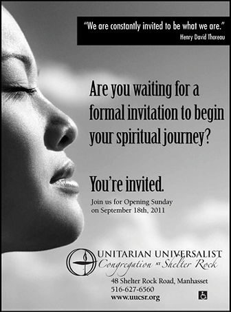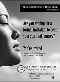 To create an inspiring and welcoming community where all are welcomed and all are encouraged to ponder the "big questions" in life and to make a difference in the world. That is the mission of the UU congregation at Shelter Rock and that was the objective and the result of the ongoing ad campaigns we created for them.